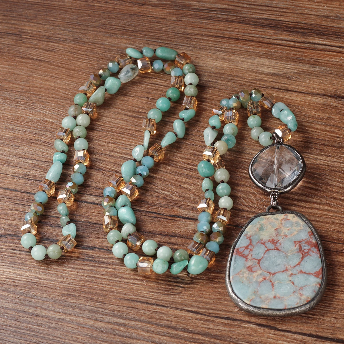 Nome do Produto: Elegância Natural – Colar Feminino com Pingente de Pedra Agalmatolite e Cristal Irregular