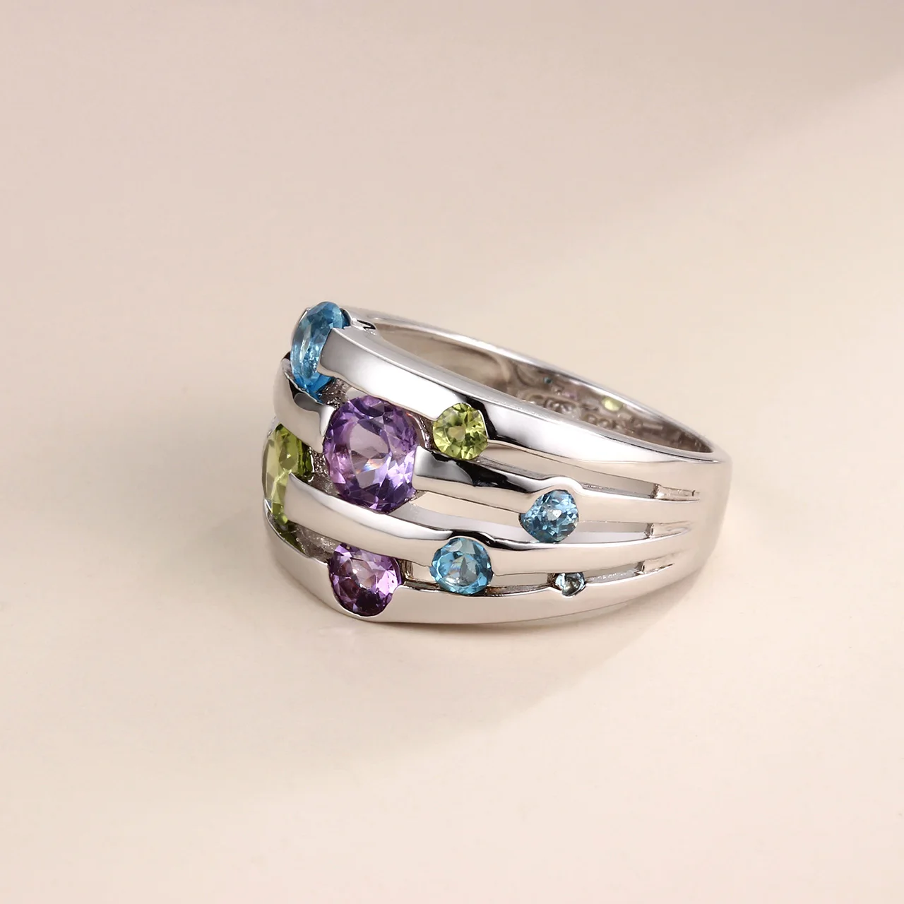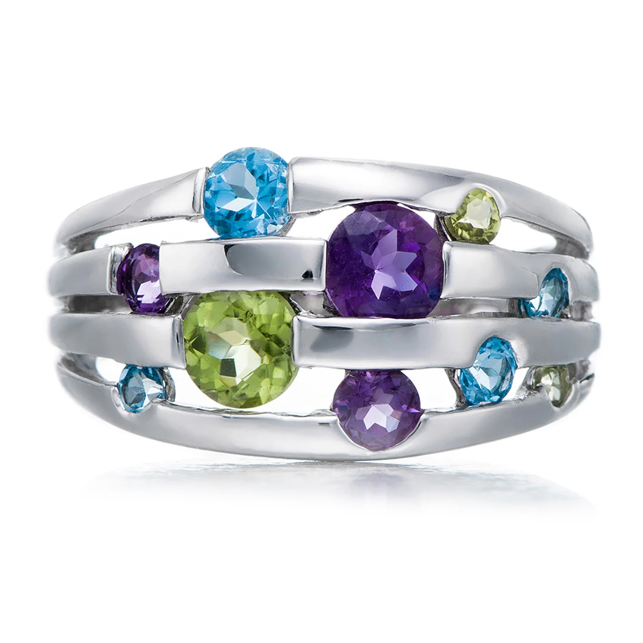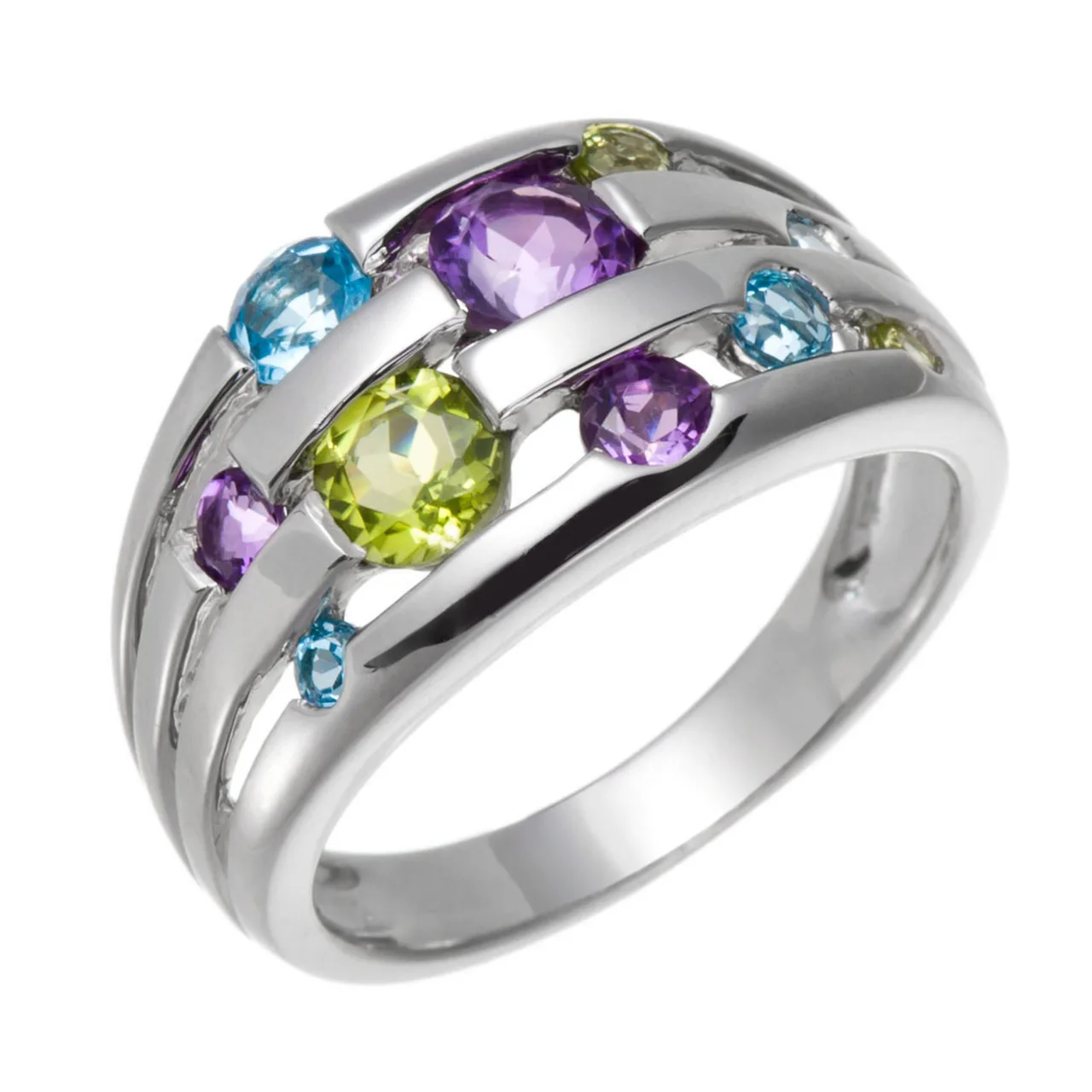 Informação da joia: 0.54ctw peridoto, 0.45ctw ametista, topázio azul suíço, ródio sobre anel de prata esterlina