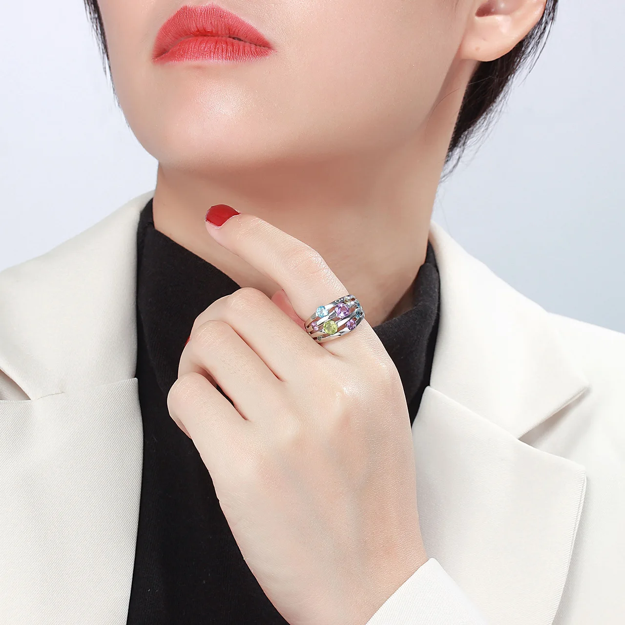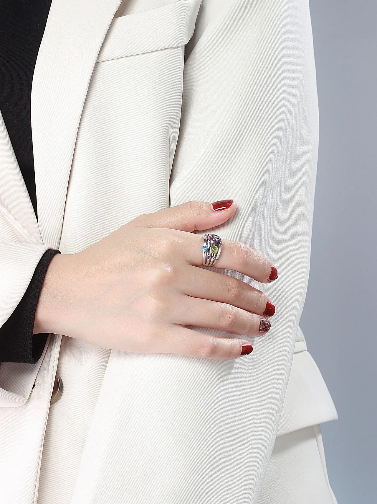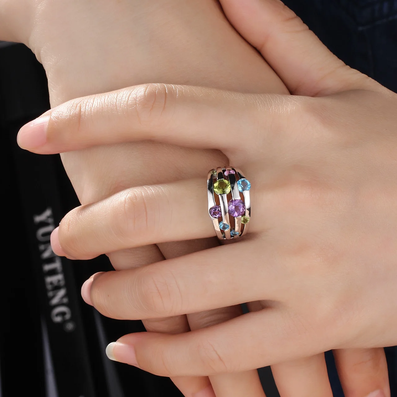 Informação da joia: 0.54ctw peridoto, 0.45ctw ametista, topázio azul suíço, ródio sobre anel de prata esterlina
