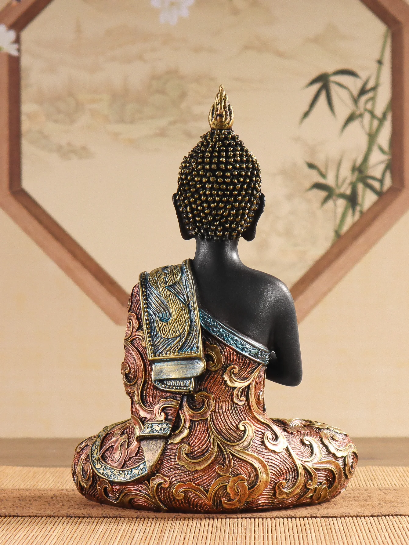 Feito em tons de preto profundo e ouro reluzente, com ornamentos em azul, vermelho e branco que dão vida à figura, este Buda sentado carrega uma aura de serenidade e propósito. Seu manto tradicional cai suavemente sobre o corpo, enquanto a postura meditativa transmite estabilidade, foco e equilíbrio interior.
