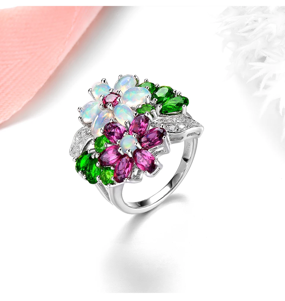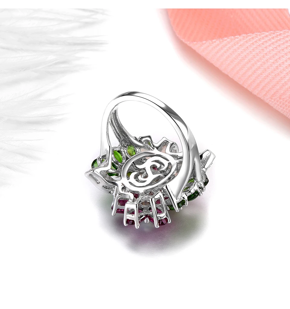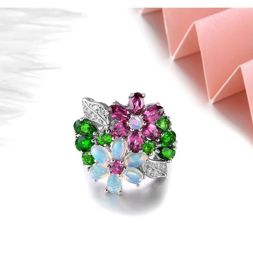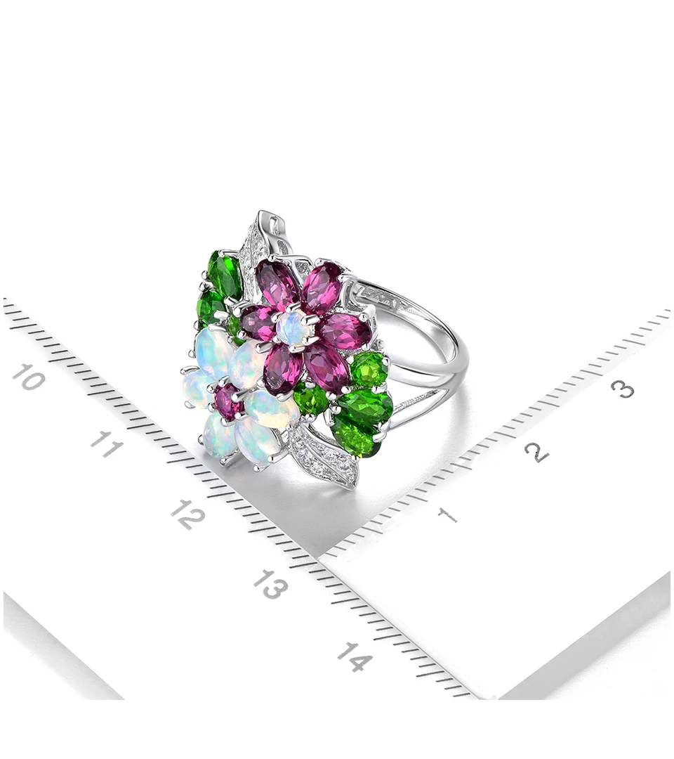 Design floral luxuoso com 4ct de gemas naturais multicolor — brilho intenso e romântico.