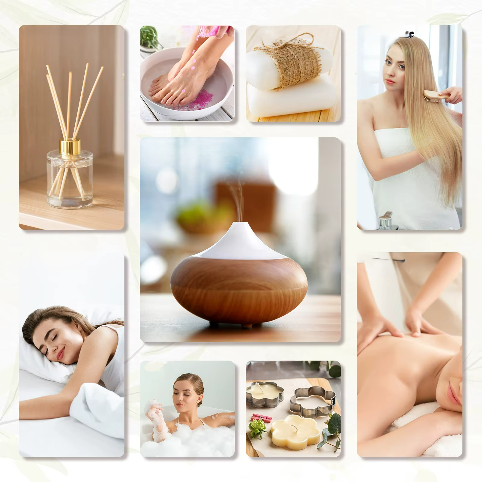 Lavanda, Jasmim, Rosa, Gerânio, Ylang Ylang, Camomila