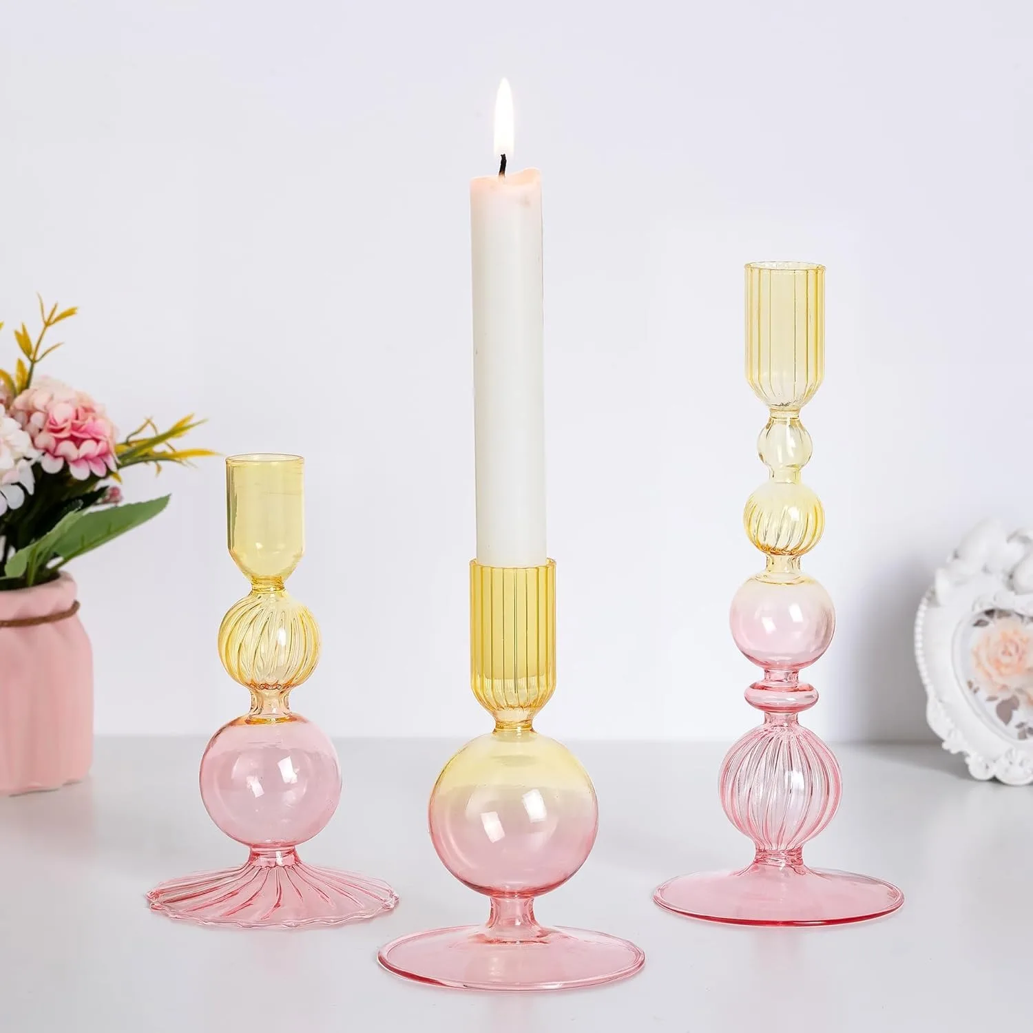 Imagine uma mesa que respira calma. Uma chama que dança suavemente. Uma flor que repousa em silêncio. O HamaMu Serene Flame & Bloom Set nasce exatamente desse encontro entre luz, natureza e contemplação — três castiçais cônicos de vidro que também funcionam como delicados mini vasos, permitindo que você componha atmosferas que iluminam não apenas o espaço, mas o estado de espírito.
